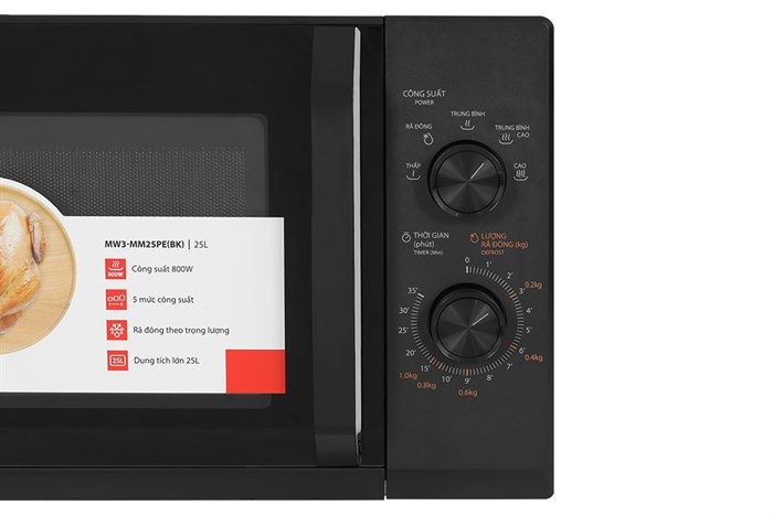 Lò vi sóng Toshiba MW3-MM25PE(BK) 25 lít có công suất vi sóng 800W, thiết kế đơn giản nhưng tăng tối đa diện tích bên trong khoang lò, dễ dàng sử dụng với bảng điều khiển nút vặn, được trang bị chuông báo khi nấu xong, có cả chế độ rã đông theo thời gian và trọng lượng, giúp bạn chuẩn bị những bữa cơm thơm ngon nhanh chóng.