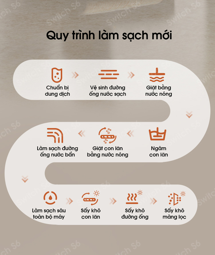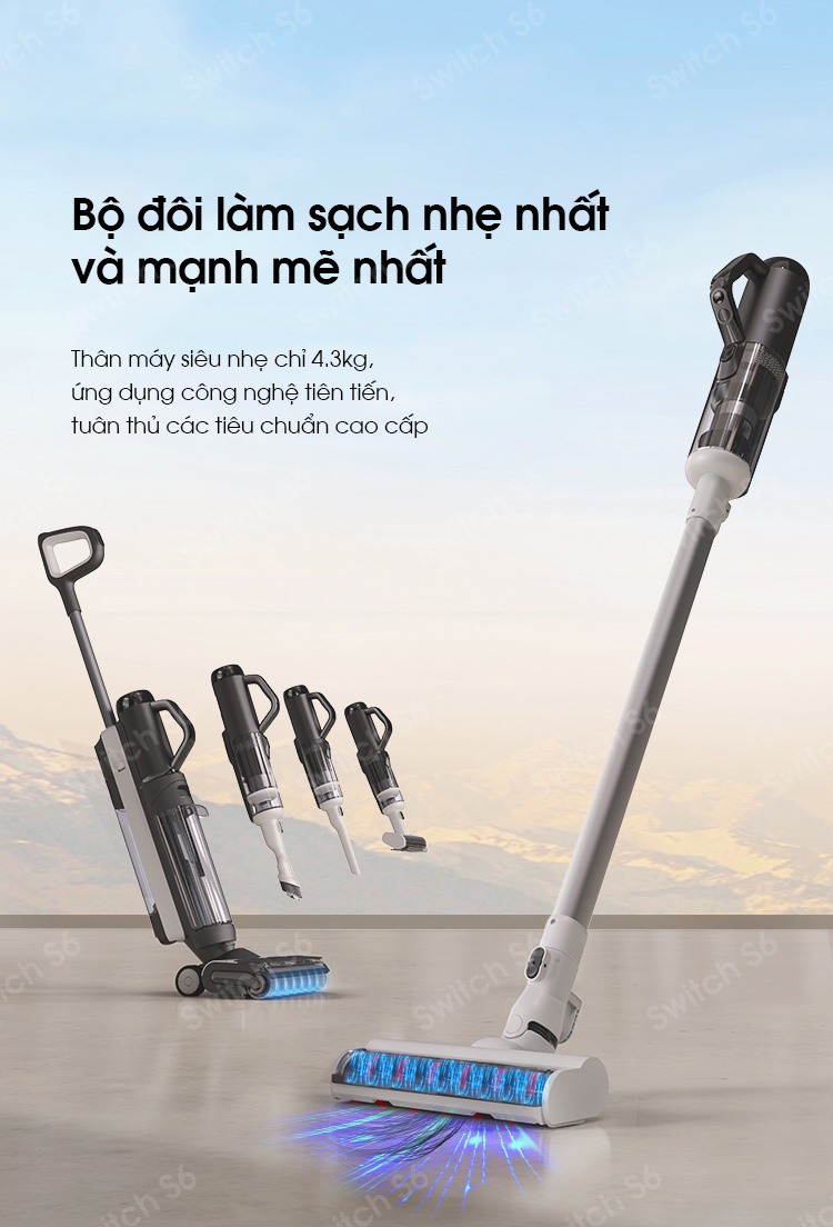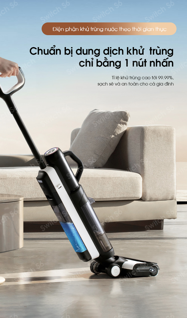 Máy hút bụi lau sàn Tineco Floor One Switch S6 được trang bị công nghệ lõi sấy nhanh toàn chuỗi nhiệt độ cao trong 5 phút với luồng nhiệt ở nhiệt độ cao 70 độ C có thể nhanh chóng làm khô chổi lăn, bộ lọc Hepa, cổng hút và các bộ phận lân cận… Đồng thời Tineco One Switch S6 giúp khử trùng vi khuẩn, nấm mốc hiệu quả, sử dụng pin mềm có tuổi thọ gấp 3 lần pin truyền thống. Thiết kế thân máy siêu nhẹ chỉ 4.3kg dễ dàng di chuyển, độ ồn thấp chỉ 78dB cùng lực hút mạnh mẽ loại bỏ mọi vết bẩn cứng đầu.