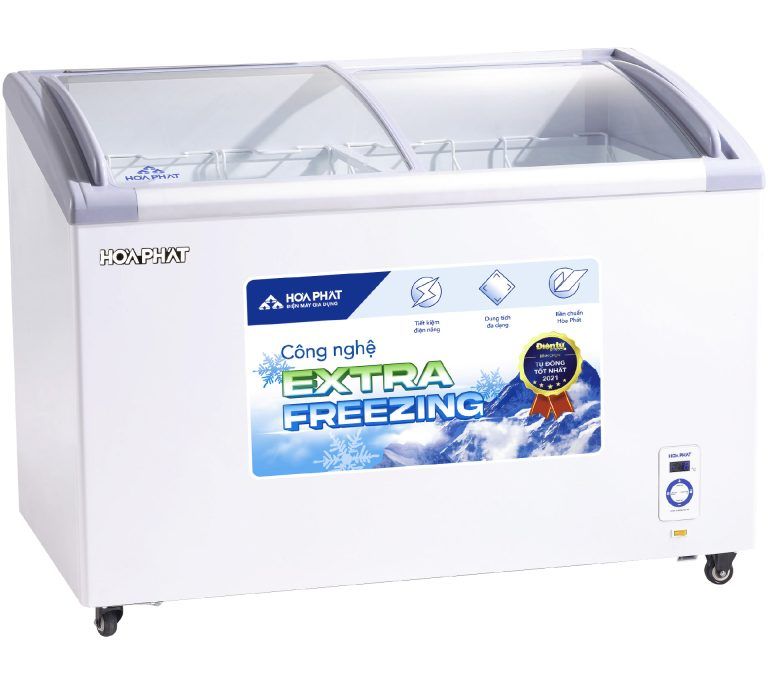 - Tủ đông mặt kính trưng bày Hòa Phát HSF AD6280.C1 sử dụng mặt kính cong cho trưng bày sản phẩm